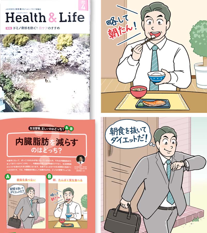 健康保険組合加入者さま向け冊子『ヘルスアンドライフ』内の連載 “生活習慣、正しいのはどっち?” にて、2026年4月号から1年間イラストを担当させていただきます。生活習慣の改善ポイントに関する2択クイズとなっております。